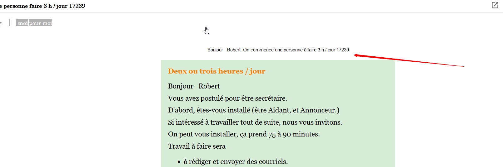Nous prendrons le courriel qui nous conviendra, ce ne sera pas facile à choisir, mais. Le courriel servira d'exemple aux autres. Les premiers jours, on prendra le travail d'une personne, le lendemain d'une autre puis après 3 ou 4 ... on choisira qui fera les rédactions de nos courriels. Nous ne demanderons pas à 5 personnes de rédiger le même courriel, ce serait de vous faire travailler pour rien, mais on aura une bonne idée de votre travail. Lorsque les personnes choisies ne fourniront pas, nous contacterons l'une des autres ayant répondu à une estimation. En étant formé, familier à faire le travail, vous serez prêt quand nous ajouterons une autre personne. Les premiers à commencer, auront presque tout de suite, d'autres tâches à faire, si elles ont le temps de le faire. Robert Grandchamp 450 421 2502
