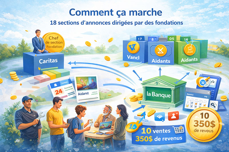 L'Agenda du Québec fonctionne avec 18 sections d'annonces, chacune dirigée par une fondation (Chef de section) et associée à une monnaie dédiée.